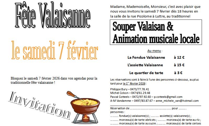 Pour réservations ou informations, contactez Pascal Cotteels (0472/97.92.60), Anne-Michèle Vandamme (0497/83.87.67) ou envoyez-nous un mail à fete.valaisanne.luttre@uprsmm.be