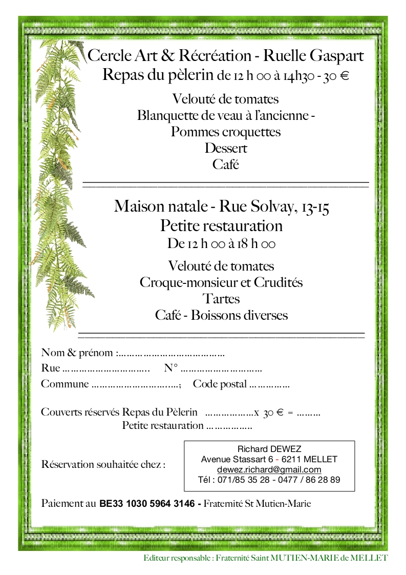 A l'occasion du grand pèlerinage à St Mutien-Marie, la Fraternité Saint Mutien-Marie propose aux pèlerins un repas au Cercle Art & Récréation. Si vous souhaitez y participer, il est souhaitable de réserver en utilisant le bulletin à télécharger reproduit ci-dessous.